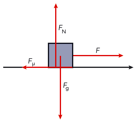 Vi drar en kista med konstant hastighet längs en horisontell yta. För att dra kistan behöver vi en kraft \( F \) som pekar i samma riktning som hastigheten. Se figur 5.21. Newtons första lag medför att resultanten av alla krafter på kistan är lika med noll. Det betyder att en lika stor horisontell kraft måste verka bakåt på kistan. Den kraften kallar vi friktionskraft eller bara friktion. Här använder vi beteckningen \( F_\mu \) för friktion. Vi får \[ F = F_\mu \] När hastigheten är konstant är friktionen på kistan från underlaget lika stor som dragkraften och verkar bakåt.