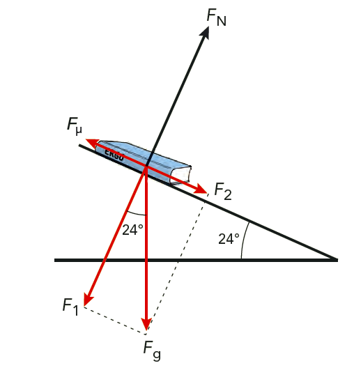Ur figuren får vi \[ F_1 = mg \cos \alpha = 0{,}4 \cdot 9{,}82 \cdot \cos 24 \text{°} \text{ N} = 3{,}6 \text{ N} \] \[ F_2 = mg \sin \alpha = 0{,}4 \cdot 9{,}82 \cdot \sin 24 \text{°} \text{ N} = 1{,}6 \text{ N} \]